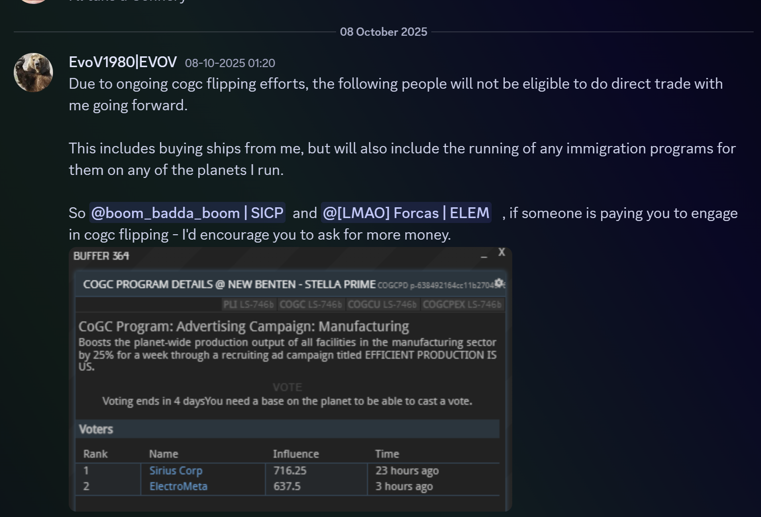 While the CoGC votes were raging, another scandal broke out. On 24th Sept 3025, boom_badda_boom, a trader, privately admitted to OptimizedFunction that he had been monitoring bot command channels of other investment funds in the Capital Management (CM) discord server, front-running their trades to extract profit. He also mocked sellers who sold him cheap goods planetside for giving up on such great profits.