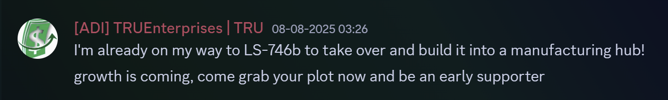boom_badda_boom resurfaced in GTU public chat a few days later, offering 0% loans to seed Manufacturing bases on Stella Prime. Incredibly, he pinged Governor OptimizedFunction directly, demanding immigration program support for his projects. This was widely seen as audacious and distasteful.
