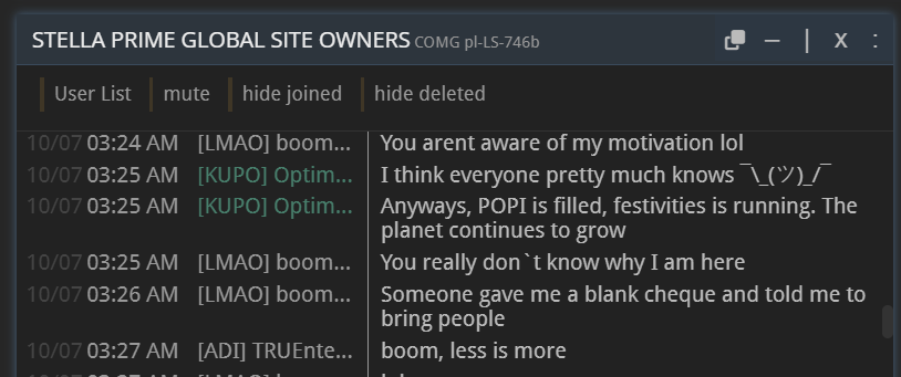 Boom, along with Forcas, then built a base on Stella Prime. On 7th Oct 3025, boom publicly admitted in Stella Prime planet chat to have been paid off to conduct this recruitment operation against the fuel refiners of Stella Prime.